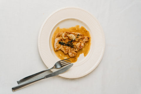 Pechuga de pollo dorada en mantequilla con ajo y tomillo, jugosa y aromática, acompañada de una salsa sencilla hecha con el fondo de la sartén, ideal para una comida rápida y llena de sabor.